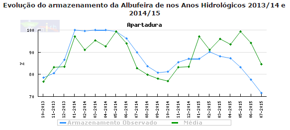 No gráfico anterior podemos observar a evolução do armazenamento de água nas barragens e albufeiras da Bacia Hidrográfica do rio Tejo, da qual a Apartadura faz parte.