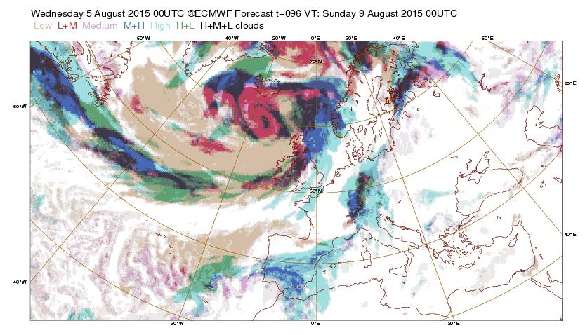 Como podemos observar na imagem, preveem-se muitas nuvens médias e altas para o domingo, na Península Ibérica.