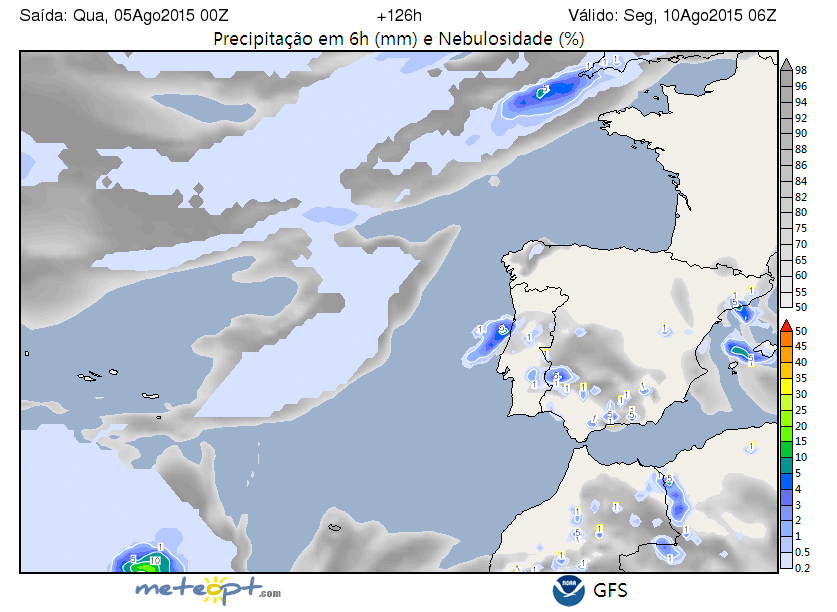 Esta massa de ar quente chegará à península acompanhada por nuvens médias e altas, que provocarão uma subida da temperatura mínima, que poderá atingir valores muito elevados (24ºC no domingo, em Portalegre).